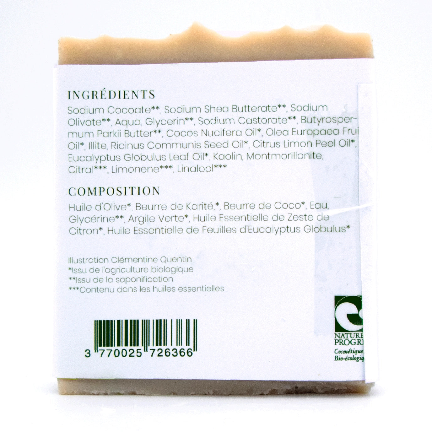 Savon bio et surgras pour tous les types de peaux, convient aux hommes et aux femmes. Enrichi à l'huile de ricin - Contient de l'argile verte purifiante - Aux huiles essentielles d'Eucalyptus et de Citron bio pour une fraicheur totale. Ce savon est formulé de façon à nettoyer et nourrir la peau en profondeur, et pour être légèrement gommant. C’est un savon à l’huile d’olive, au beurre de karité, à l’huile de ricin et à l’argile verte surfine. Il est fabriqué à à partir de matières premières biologiques uniquement. Il est parfumé aux huiles essentielles d’Eucalyptus et de Citron bio. Il est labellisé Nature et Progrès. Dans ce savon purifiant, il y a 6 % de surgras environ. Cela signifie que les huiles sont présentes dans le savon sous forme brute. Ainsi, lors de l’application de ce savon sur la peau de votre peau, ces huiles non transformées en savon vont nourrir votre épiderme comme si vous les étendiez vous-mêmes. C’est le gros avantage des savons saponifiés à froid.